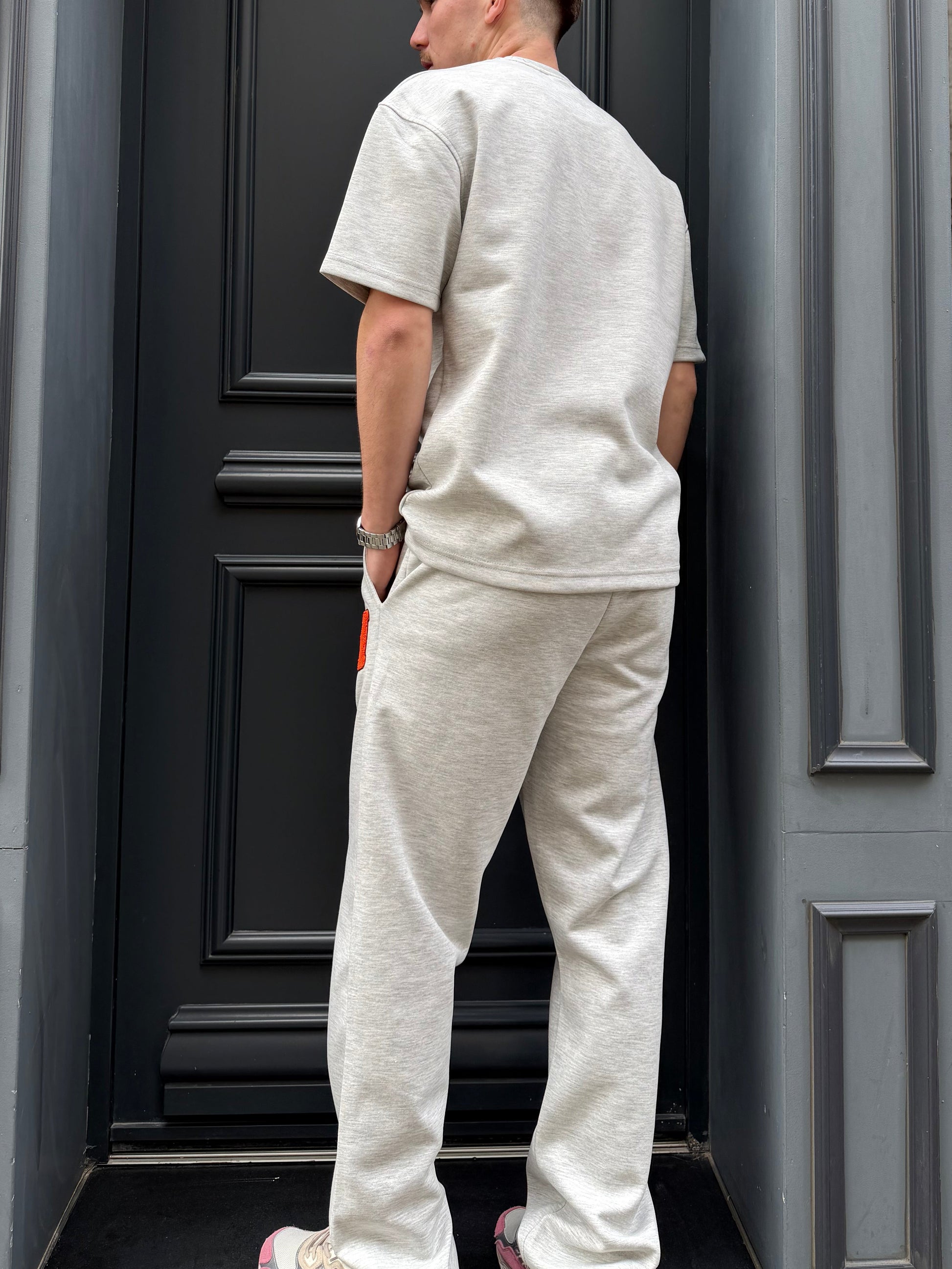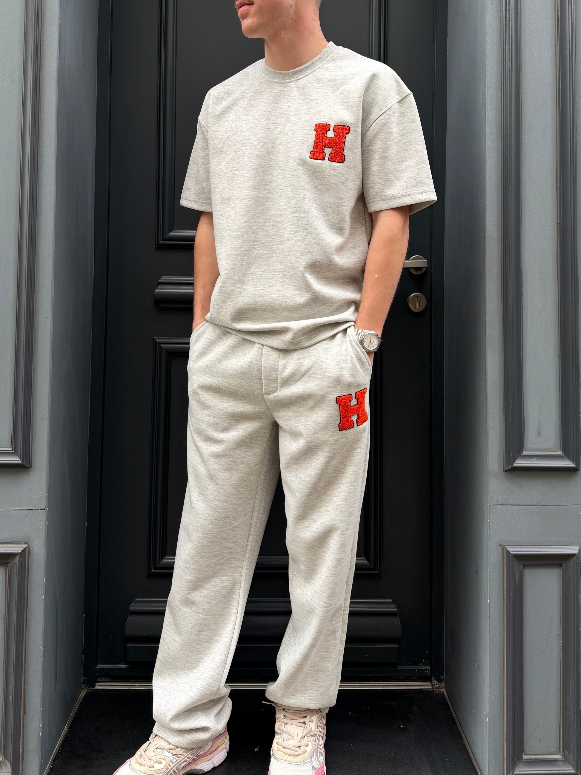 Adopte un look casual maîtrisé avec cet ensemble à l’allure moderne et épurée. Composé d’un t-shirt et d’un pantalon assorti, il mise sur une teinte neutre facile à porter, relevée par un patch “H” texturé qui apporte une touche de contraste et de caractère.
